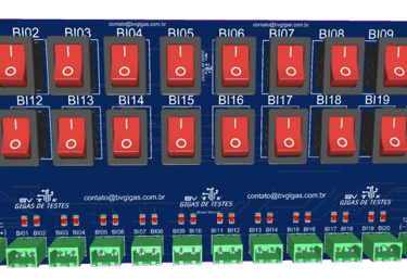 DESCRIÇÃO TÉCNICA: Placa de circuito impresso para simulação de sinais binários (I/O) através de 20 chaves gangorra com LEDs de sinalização;